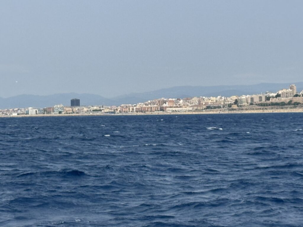 Weiter: Um 6.30 h lichten wir den Anker, dann entlang der Küste, vorbei an Tarragona, dass von See viel schöner aussieht als an Land, aber dennoch mit seinem riesigen Umschlaghafen nicht wirklich romantisch ist. Der Wind ist schwierig, mal dolle mit 25 Knoten, dann wieder nix. Ich übernehme die Schicht mit wenig Wind, der Motor schnurrt. Motorsegeln nennt man das. Dann ändert der Wind seine Richtung wird stärker. Ich traue mich die Segel zu öffnen, den Motor zu reduzieren, zu segeln! Am Ende fahren wir mit 9,2 Knoten durchs Wasser. Leider lässt der Wind wieder nach, und der Motor nimmt uns wieder ein Stück des Weges.