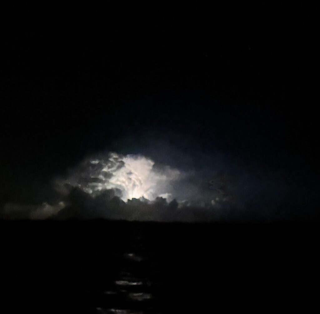 Die Nacht war ok bis ich um 12.00 h auf einmal den aufziehenden Sturm bemerkte. In Nordost dann ein riesiges Gewitter! Was für ein Naturspektakel, bin ich froh nicht darin verwickelt zu sein. Bis morgen frischte der Wind auf, die Wellen stärker. Schlafen ging so lala. Heute wollten wir einen Pausentag einlegen, Martin hatte zu arbeiten und dann wollten wir ein bisschen die Umgebung erkunden. Doch es kam anders (bis auf das Arbeiten).