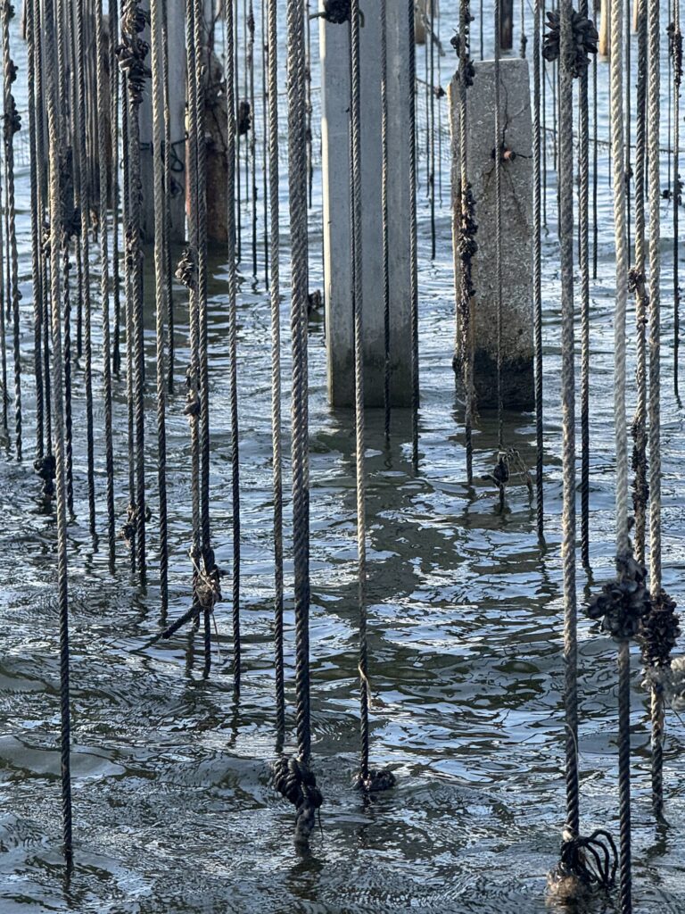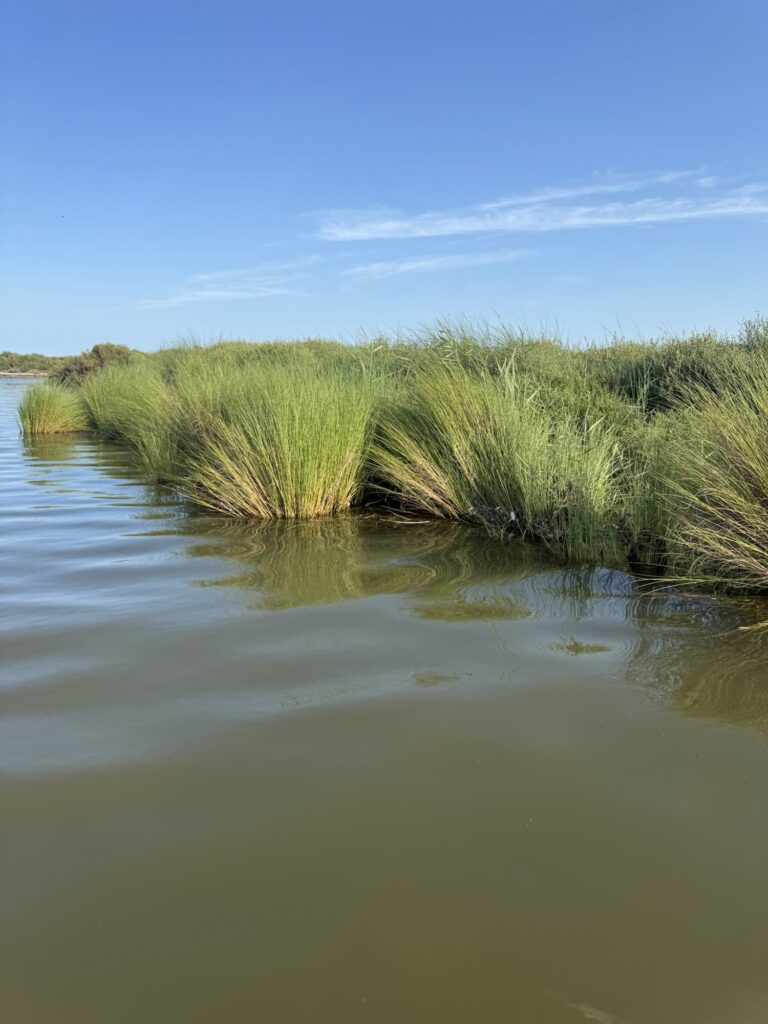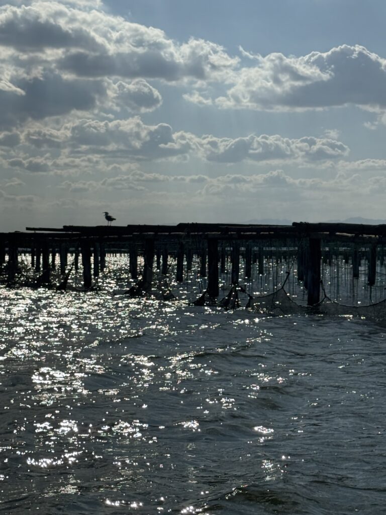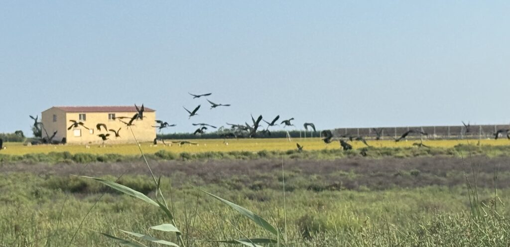 Um 17.00 Uhr wagten wir uns ans Dingy, warum ging es letztens nicht? Naja, es braucht halt Benzin und der Tank fasst nur 1,5 Liter. Wir erkundeten die nächste Umgebung. Ich hatte mich vor lauter Reparaturen nicht auf die Gegend vorbereitet. Nun war ich aber verblüfft von der Artenvielfalt, den Vögeln, den Sound der Landschaft. Was für ein besonders Landschaftsgebiet. Ich recherchiert und was soll ich sagen, wir sind mitten im Biosphärenreservat Terres de l’Ebre. Es ist eines der bedeutendsten Feuchtgebiete des westlichen Mittelmeers. Ein Mosaik aus Lagunen, Dünen, Salzmarschen und Reisfeldern beherbergt eine außergewöhnliche Biodiversität. Über 300 Vogelarten – darunter Flamingos und Reiher – machen es zu einer zentralen Station auf der Zugroute zwischen Afrika und Europa. Mittendrin finden wir eine Muschelzucht. Fischer ziehen ihre Reusen aus dem Wasser. Und Kleinflugzeuge landen direkt neben der Lagune und wie ich später recherchierte, neben der Kernzone. Schade, dass wir nicht mehr Zeit haben, um uns hier weiter umzuschauen. Verblüfft bin ich von der schlechten Informationslage des Biosphärenreservats. Im Netz findet man nicht wirklich viele Informationen und nur dank Google Translate auch in einer anderen Sprache als Katalanisch.