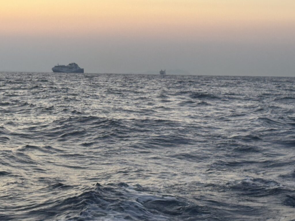 Der Wind ist nicht wie vorhergesagt da, wir schmeißen den Motor an. Viele größere Frachter sind unterwegs von und zum Hafen von Marseille. Ich mache meine erste Schicht, Martin schläft noch mal eine Runde. Die großen Pötte flößen mir ziemlich Respekt ein, da sie schnell fahren und auf einmal sehr riesig vor dir sind. Ich freue mich über die Informationstechnik an Bord. Jeder dieser großen Schiffe, hat ein sogenanntes AIS an Bord, ich sehe diese Schiffe auf meinem Plotter, der in die Armatur eingebaut ist. Hier raufklicken und schon erhalte ich alle möglichen Informationen über Länge, Breite, Destination, mich interessiert nur, ob unser Abstand sicher ist. Es kommt wieder Wind, erst wenig, dann stärker, es wird wellig, wir schaukeln ziemlich rum. Welle von der Seite. Kochen bei so einem schaukelnden Boot ist auch herausfordernd. Heute gibt es eine Dose Ravioli mit frischen Salat. Ich muss mich erstmal an das Geschaukel gewöhnen. Die herrliche Nachricht: keiner von uns ist Seekrank geworden.