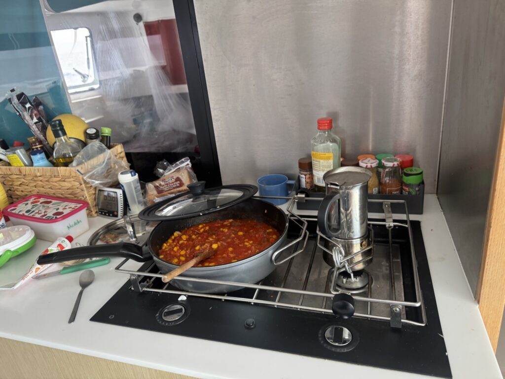 Die Nacht bricht an, wir vereinbaren 2 h Schichten, so dass jeder mal schlafen kann. Meine Schicht beginnt um 22.00 h. Ziemlich wenig los, ich übe mich in Lichtzeichen deuten, versuche mich mit einem Hörbuch wach zu halten und singe mich mutig. Dann ist Martin dran. Als alter Seebär setzt er natürlich gleich Segel, sobald die Windverhältnisse es zu lassen. Es folgt ziemlich viel Lärm vom Segelsetzen, der Winsch. Ich bin sauer, weil ich diese ganzen Geräusche nicht einordnen kann, läuft alles normal, oder braucht Martin Hilfe? Ich komme nicht zur Ruhe, erst eine Stunde später, nachdem ich mit Martin geklärt habe, dass ich die Abläufe auf so einem Segelboot nicht kenne. Das Gequitsche und Gepeitsche der Segel macht mir Angst. Martin lässt mich länger schlafen. Gegen Morgen wird der Wind wieder rauer, ich bin ziemlich angestrengt, kaum ist man wach, sofort gibt es etwas zu tun, Leinen klarieren, Genua rausholen oder reinholen, es gibt immer was. Es ist auch oft laut. Ich fühle mich etwas hilflos, gerade wenn ich nachts alleine steuere, weiß ich noch nicht, wann ich Segel setzen soll. Der Schlafmangel zerrt an mir. Das Segeln nimmt sehr viel Raum ein, wenn der Wind macht was er will, habe ich das Gefühl, das Boot, die Wellen, der Wind hat uns im Griff und nicht umgekehrt. Um 12.00 h haben wir erst ein dünnes Tost mit Kaffee in uns, daher wage ich es bei ziemlich rauen Wind zu kochen. Es muss was herzhaftes sein, Nudeln! Nudeln machen glücklich! Und gehaltvoll soll es sein, also mit Tunfisch, Mais, Schafskäse und ein Stück Eberswalder grün kommt auch noch rein. Irena schenkte mir bei meiner Abschiedsparty in Spechthausen einen Strauß mit Kräutern, den ich trocknete und der Rosmarin wandert jetzt in meinen Topf 😊. Lecker, das tut gut. Außerdem viel trinken, dass vergesse ich leider gern.