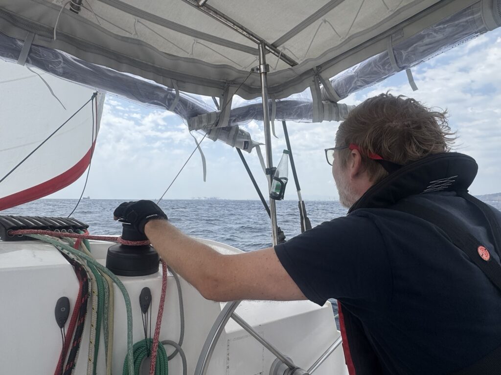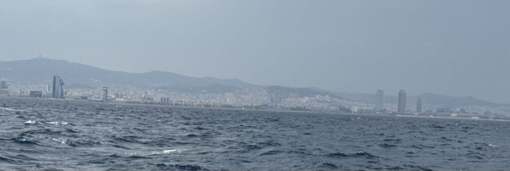 Wir sehen die Skyline von Barcelona, es ist grau und fängt an zu nieseln, der Wind super unstet, mal doll, dann nur noch ein laues Lüftchen, Segel runter, Segel hoch, Genua rein, Genua raus. Martin instruiert eine Halse, ich ziehe mir noch schnell meine neuen Segelhandschuhe an. Die Halse geht schief, die Schoten reißen sich aus meinen Händen, ich kann den Druck nicht halten. „Lass los“ brüllt Martin. Auf einmal höllischer Lärm, die Schoten wickeln sich umeinander, die Genua flackert, der Wind macht krach. Mir tun die Hände weh, ich will nicht mehr! „Alles nicht schlimm! Kann man alles lösen!“ sagt Martin, krabbelt aufs Deck und entzerrt den Seilsalat. Ich gucke dumm aus der Wäsche. Segeln ist doch kein Kinderspiel und zerrt an den Nerven, trotz guten Essen.