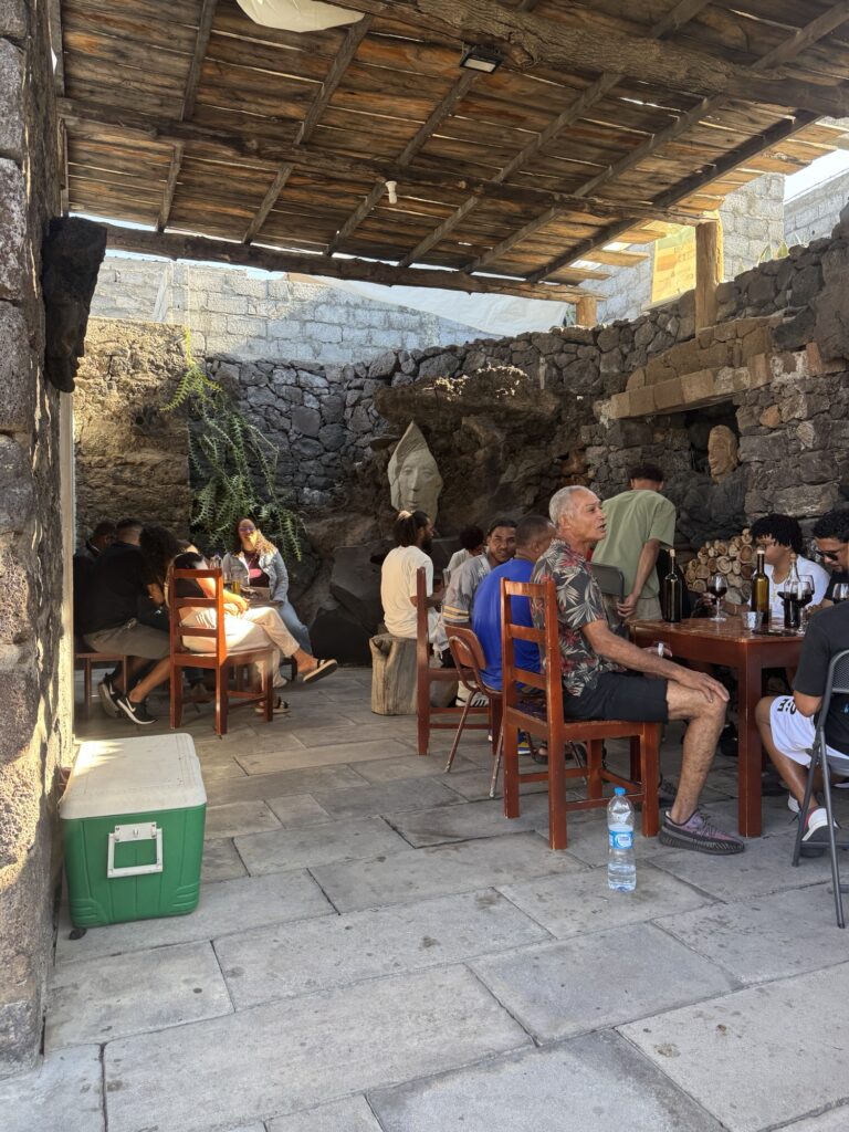 Die Dörfer werden von den Menschen wieder aufgebaut. Das zu sehen, löst in mir gemischte Gefühle aus, wie muss es sein auf einen Vulkan zu leben und damit zu rechnen, dass man wieder zu schauen muss, dass alles genommen wird? Der Wein, die Spezialität Fogos, wächst schon wieder auf der Asche. Der Wein aus Fogo ist sehr berühmt auch wir genießen ihn in der Kneipe am Rande des Kraters, süffig. Mit uns eine große Runde von Heimaturlaubern. Es geht lustig zu und es wird gesungen.