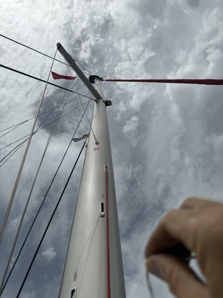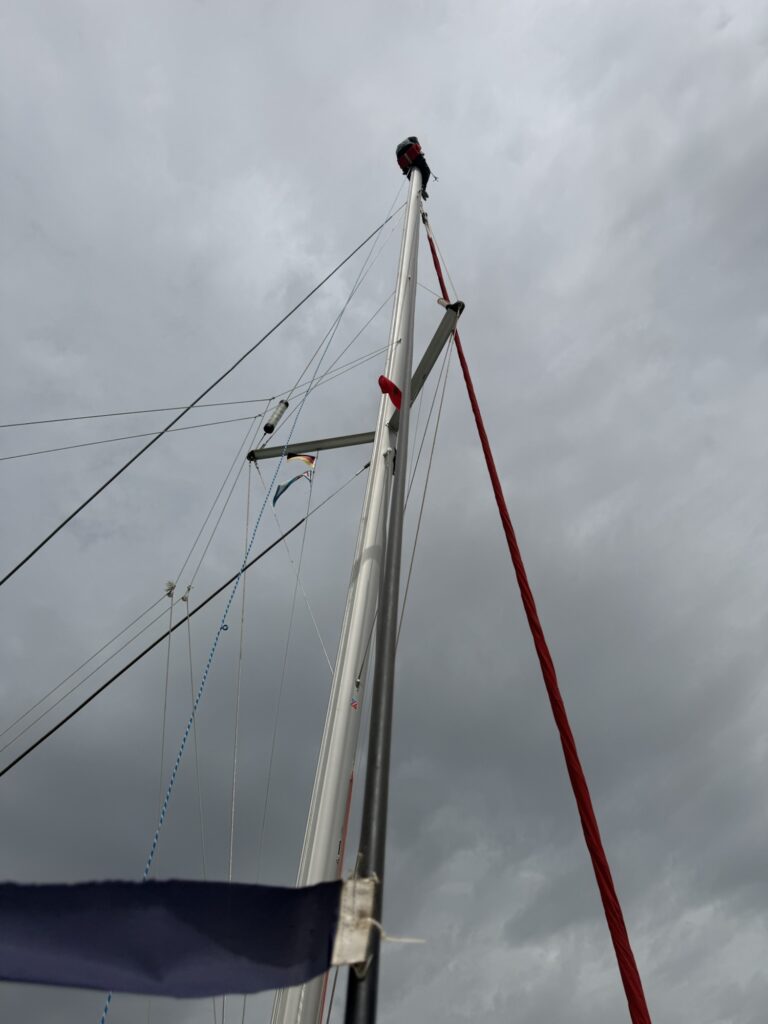 Und heute bin ich über mich hinausgewachsen und mächtig stolz auf mich. Martin berichtete ja, dass uns das Fall (also die Leine) gerissen ist, die das Leichtwindsegel am Mast bindet. Wir mussten also auf den Mast hinauf, um ein neues Fall in den Mast einzufädeln. Bisher ist Martin auf den Mast, doch heute war ich dran, weil auch das rausfädeln unten am Mast einen großen Menschen erfordert hat. Der Auslass ist ziemlich hoch angebracht. Wir haben alle Schritte genau besprochen. Ich habe vorher fleißig Knoten geübt und etwas Gymnastik gemacht. Und dann zog Martin mich in den Mast. Leider habe ich mein Handy nicht mitgenommen, es war sehr hoch und es hat geschwankt! Und wat soll ick sagen: alles hat jut geklappt und ich klettere das nächste Mal gern wieder in den Mast!