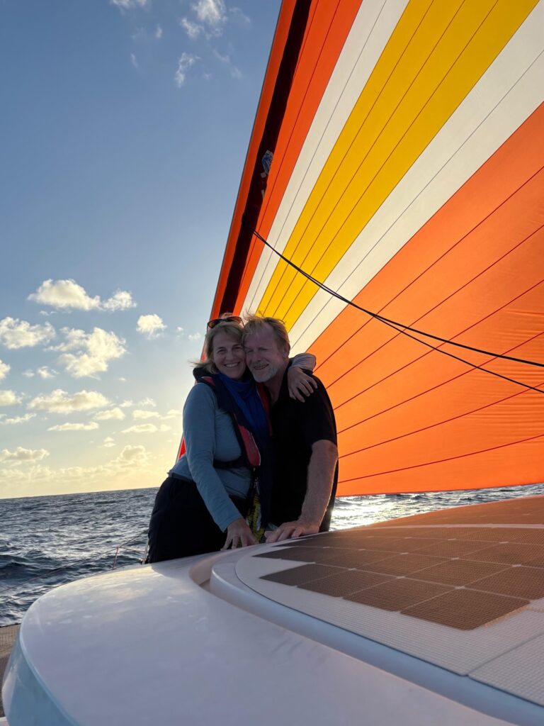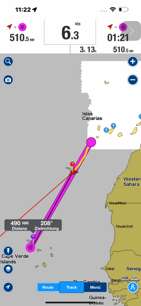 Nun sitze ich also auf der Biosphera Mitten im Ozean und tippe, jetzt sind es nur noch 494,4 Meilen vor Mindelo (Kap Verden). Wir sind seit Santa Cruz (La Palma) eine neue tolle Crew. Vor der Abfahrt konnten wir gemeinsam noch viele To dos erledigen. Was für ein Geschenk so viele begeisterte Hände zum Helfen zu haben! Für jede Aufgabe gab es ein Post It, und innerhalb von zwei Tagen sind wir beim Lösen der Aufgaben als richtige Crew zusammengewachsen. Jetzt genießen wir das Meer, den Mond bei Nacht und sind für allerlei gute Gespräche dankbar.