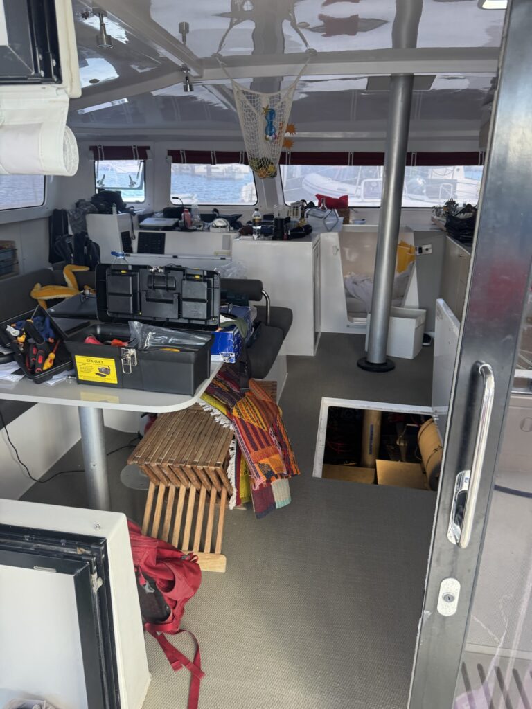Kaputte Steuerleine, Wassereinbruch im Ruderraum, korrodierte Gasventile, Elektrik and Deck, Verlängerung der Rehlingstützen und bestimmt hab ich was vergessen. Martins Telefon ist voll von Fotos, mit Bauteilen und nicht mit piktoresken Urlaubsfotos 😊